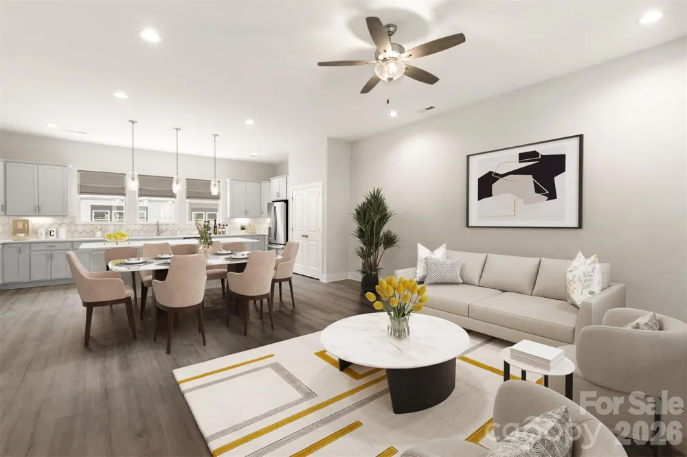 Covered front porch leads to open family room, dining & kitchen w/ 10' ceiling. 9' ceilings are on the 1st & 3rd floors. 1st floor Flex room w/ half bath & closet + a 2-car garage. 3rd floor includes 3 bedrooms + laundry closet w/ GE 2-in-1 washer/dryer included. 52" ceiling fan is included in the Living room, Flex room & all bedrooms. Kitchen includes 42" cabinets, oversized island, quartz counters, backsplash, under-cabinet lighting, double trash pullout, large SS undermount sink, GE SS app w/ gas range & French door refrigerator included. Upstairs, the Premier Suite has a large Walk-in closet, double-sink raised height vanity w/ quartz counters, tiled floor, tiled shower w/ semi-frameless glass surround Low-maintenance LVP is throughout the first & second floors plus the third floor hallway. Oak treads with painted risers on all stairs. Close to UNC Charlotte; walk to greenway!